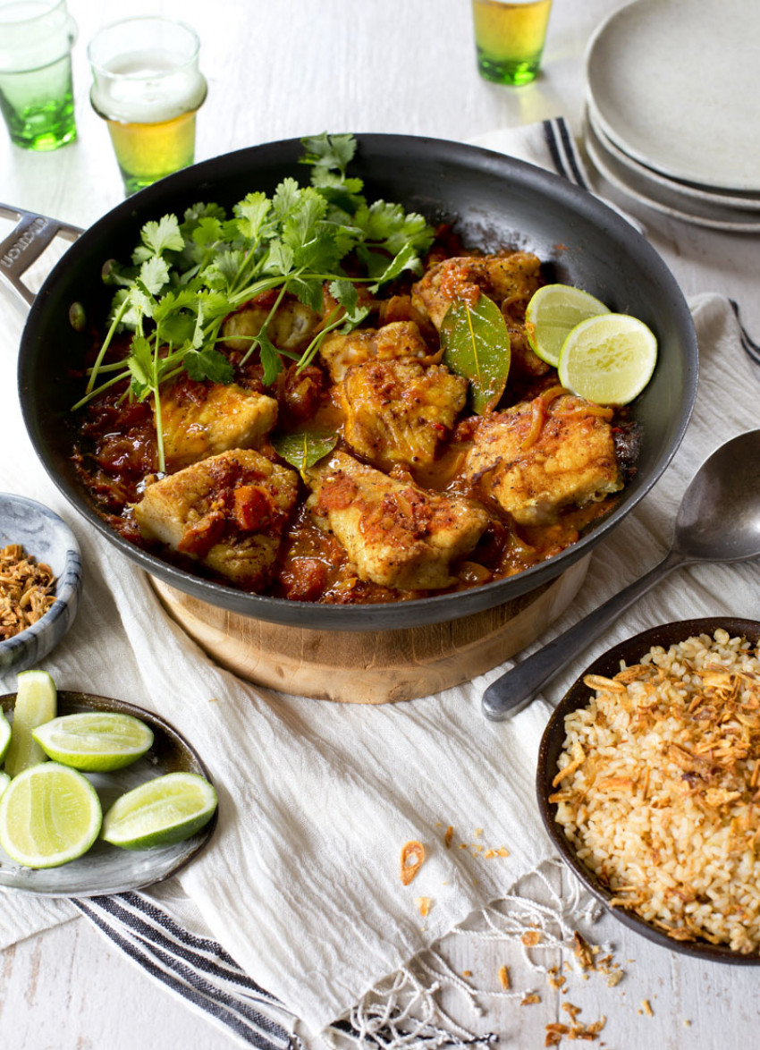 Serve with hot cooked rice, crispy shallots, coriander and lime wedges, if desired.