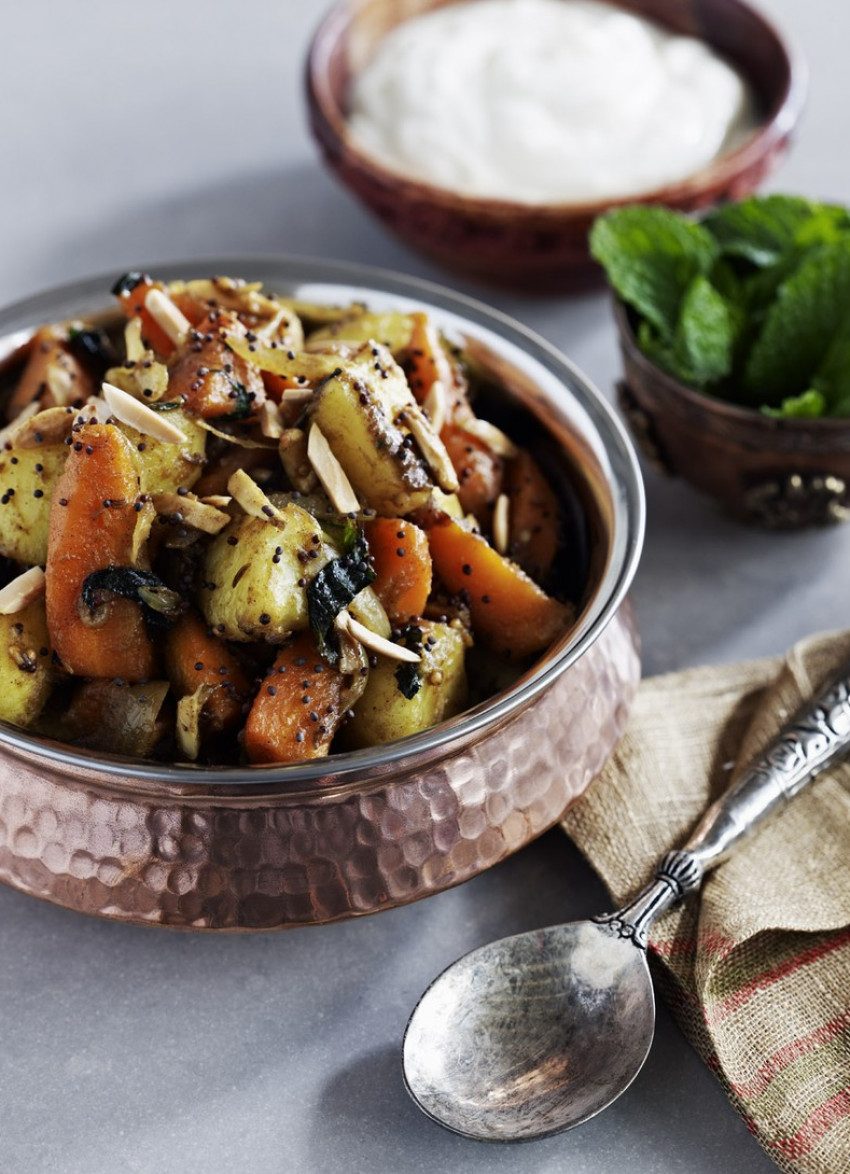 These Indian spiced potatoes and carrots are a simple way to add amazing taste to any meal. The almonds and mint create a crunchy contrast and perfect combination of textures and flavours.
