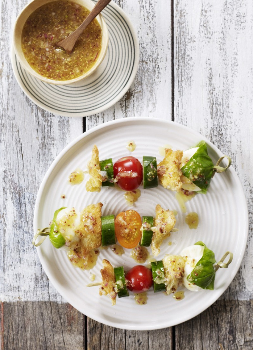 To assemble: Carefully wrap each bocconcini in a basil leaf and thread onto the skewer with the remaining ingredients. Place on a serving platter and spoon over a generous amount of dressing. Serve immediately. Makes 10 skewers