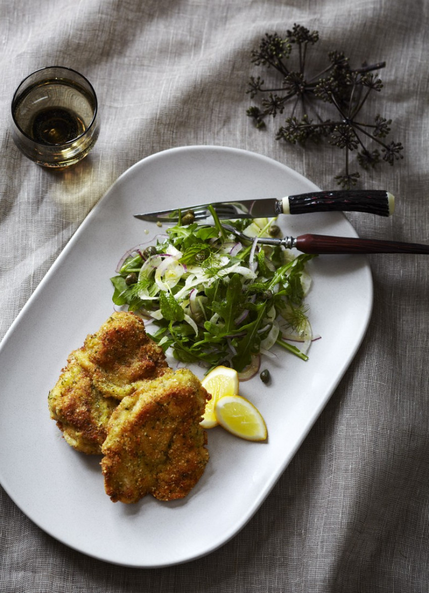 Salad: Finely shave the fennel and onion. Soak the onion in a bowl of cold water for 5 minutes then drain and squeeze dry. Combine the ingredients in a bowl and toss with enough dressing to just coat the leaves.