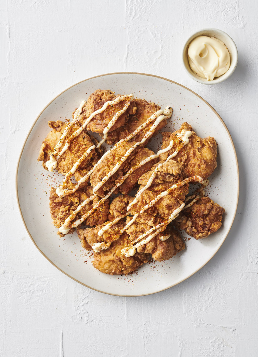 Fry the chicken in batches for 2-3 minutes, until cooked through. Drain on the kitchen towels, then use a slotted spoon to scoop out any batter that has dropped off into the oil. Fry the chicken a second time, just for a minute, until golden and super-crunchy.