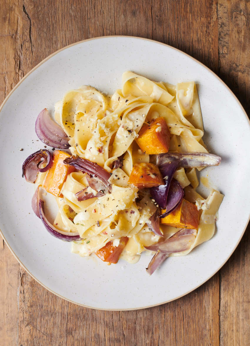 This recipe was created for Karen Walker by Sarah Tuck: Reading Karen’s interview, I was delighted to see some of her food likes – garlicky, buttery, vegetarian pasta. My sons and I share the same favourite flavours. To that end, I've created a version of a dish that we often enjoy, which has several variations. Simply swap out the red onions and kūmara for pan-fried mushrooms and a pinch of truffle salt, or sliced zucchini with mint – the magic is in the reduced cream sauce that coats the pasta so that the result is silky, not overwhelming.