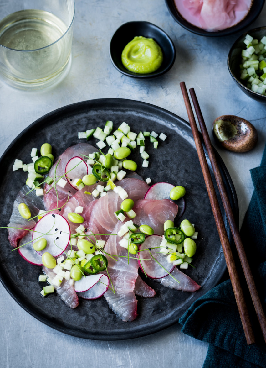 Serve kingfish layered with cubed apple and cucumber, sliced radish and green chilli, edamame beans and spring onion micro greens. Serve with extra soy sauce, pickled ginger and wasabi.
