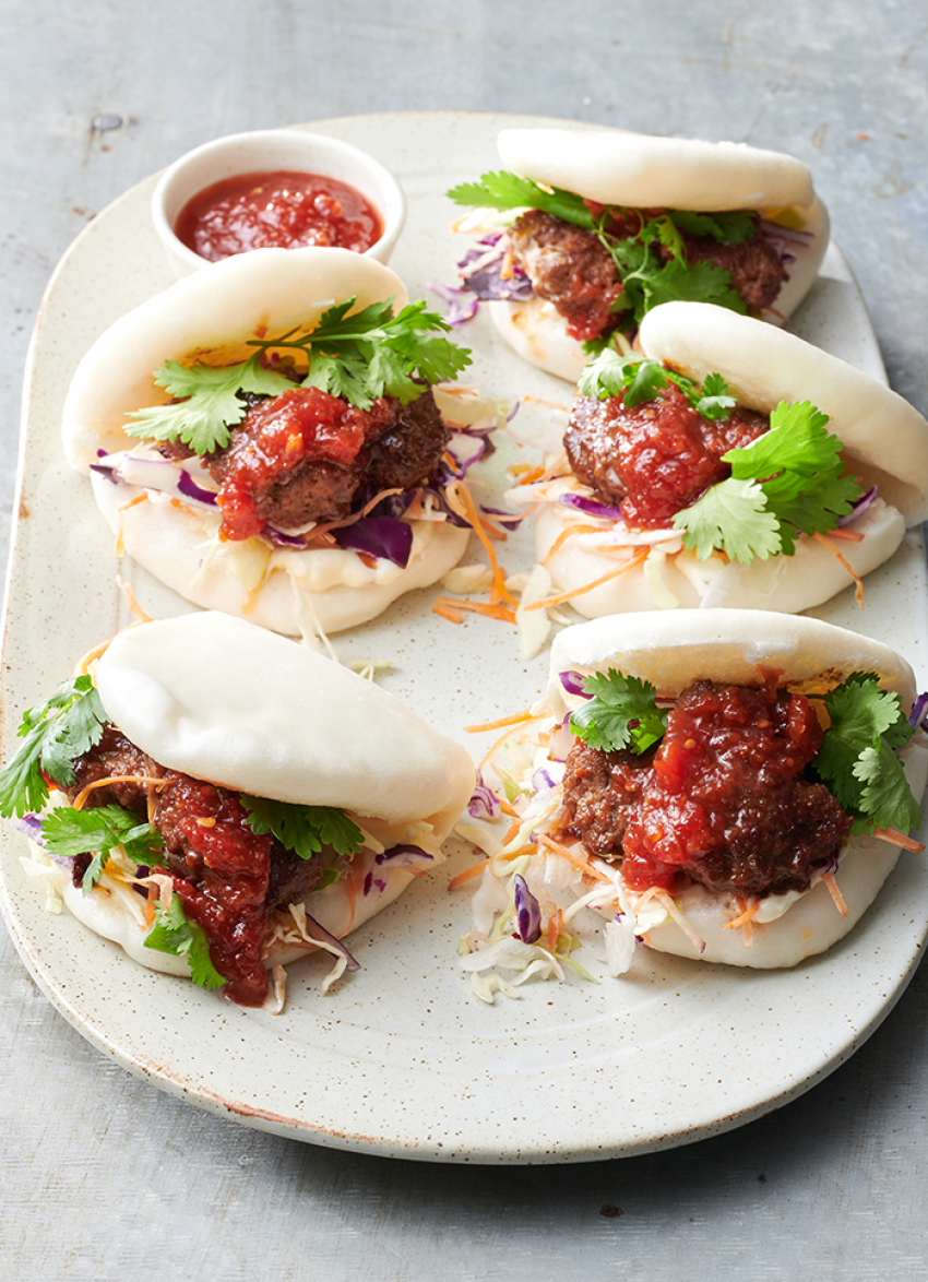 To serve: Spread the buns with mayo then fill with the coleslaw and meatballs. Top with chilli jam or chilli sauce and garnish with coriander. Makes 6 buns