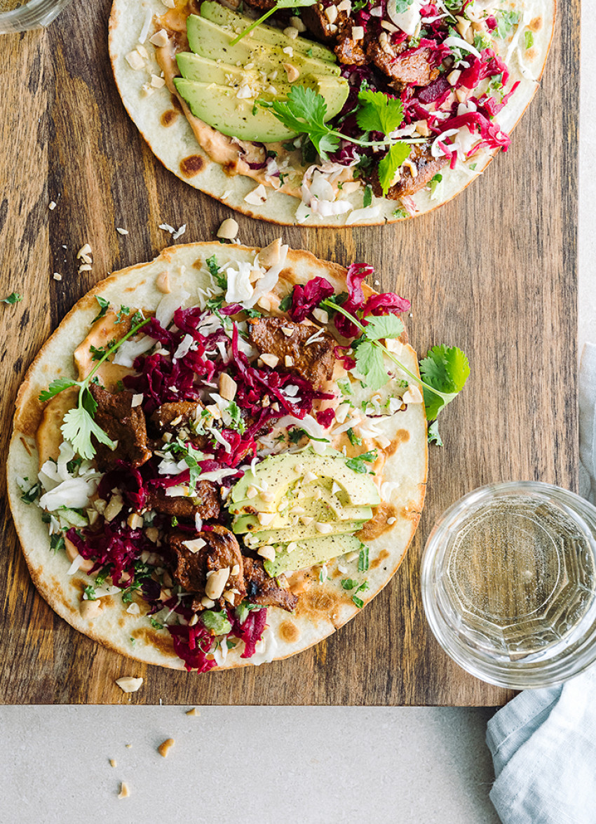 Tacos don’t have to always be Mexican. This Asian-inspired version is super tasty and the red kraut or kimchi adds a lovely tartness to balance the flavours.