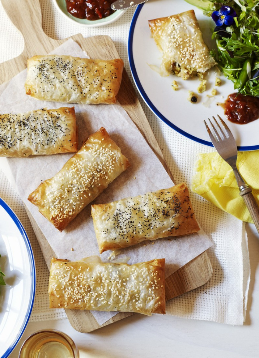 Filled with spices, currants and two cheeses, these vegetarian parcels should appeal to the whole family. (If golden skinned kumara aren’t available, use the purple skinned variety as I find Beauregard kumara are too wet for the filling.)