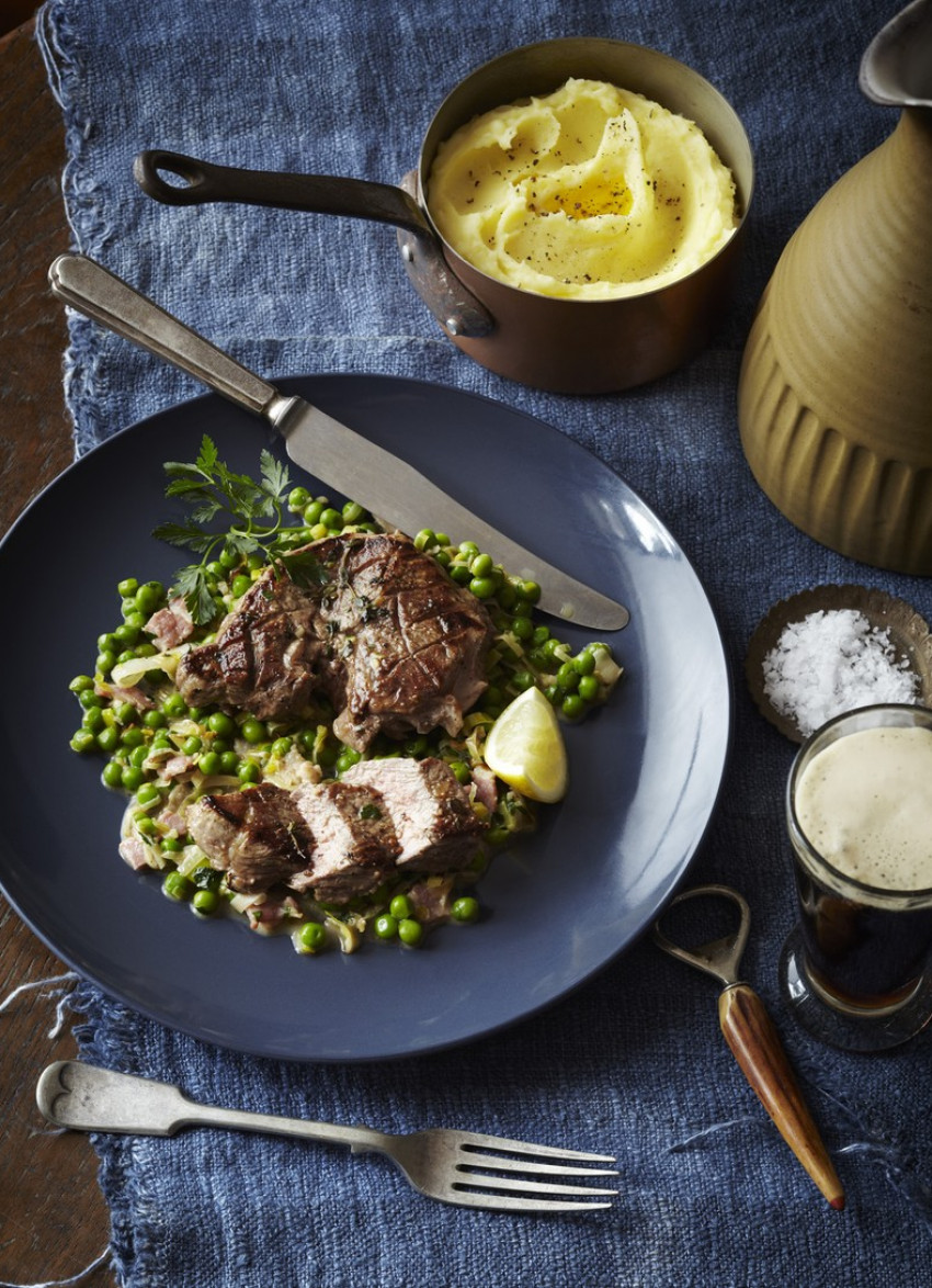 Lamb Leg Steaks with Peas, Bacon and Leeks