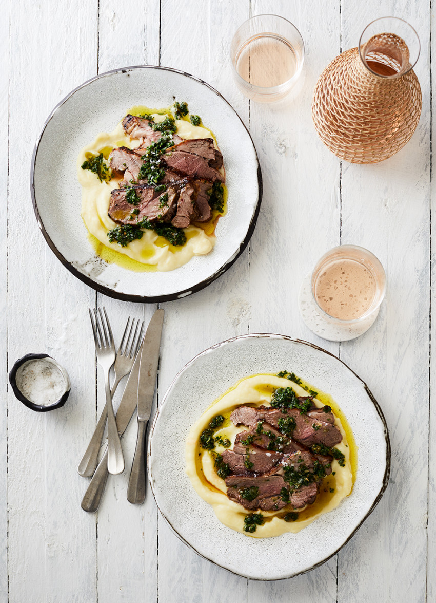 To serve: Reheat the mash if needed and spoon onto plates. Slice the lamb thinly against the grain and place on top along with the Herb and Caper Salsa. Serves 4.