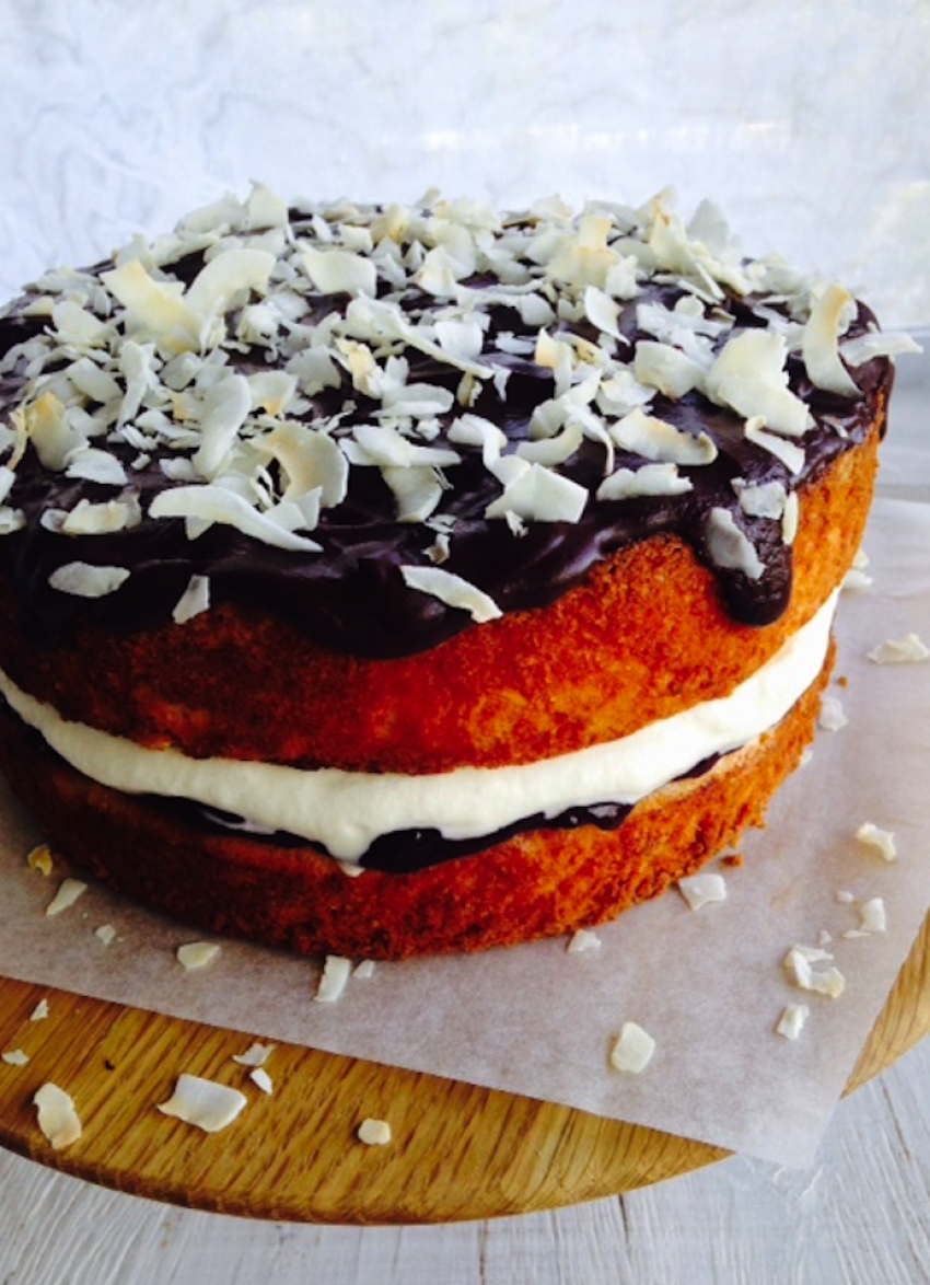 Pour over the ganache and spread evenly, letting it drizzle down the side of the cake. Top with toasted coconut if using then leave the ganache to set. Makes 1 generous cake.