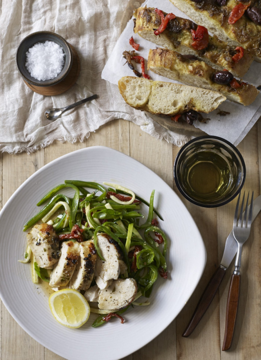 Chicken: Combine the oil, garlic, lemon zest and juice and the basil in a bowl and season. Rub all over the chicken then place in a roasting dish lined with baking paper, scraping in any basil oil left in the bowl. Roast for 25 minutes, basting occasionally until cooked. To test for doneness the juices should run clear when a skewer is inserted into the thickest part of the breast. Rest, covered lightly, for 5 minutes.