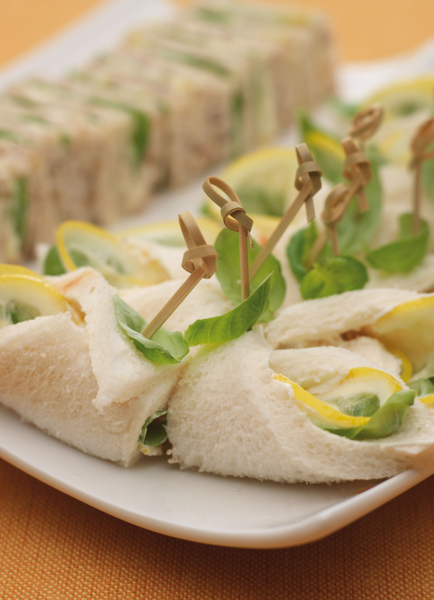 Arrange decoratively on a serving platter. Cover with a clean, damp tea towel if not using immediately. Makes 20 half rolls and 18 square sandwiches.