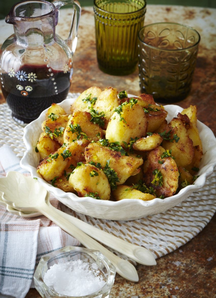 A match made in heaven: potatoes roasted in duck fat with a zesty herb and lemon topping.