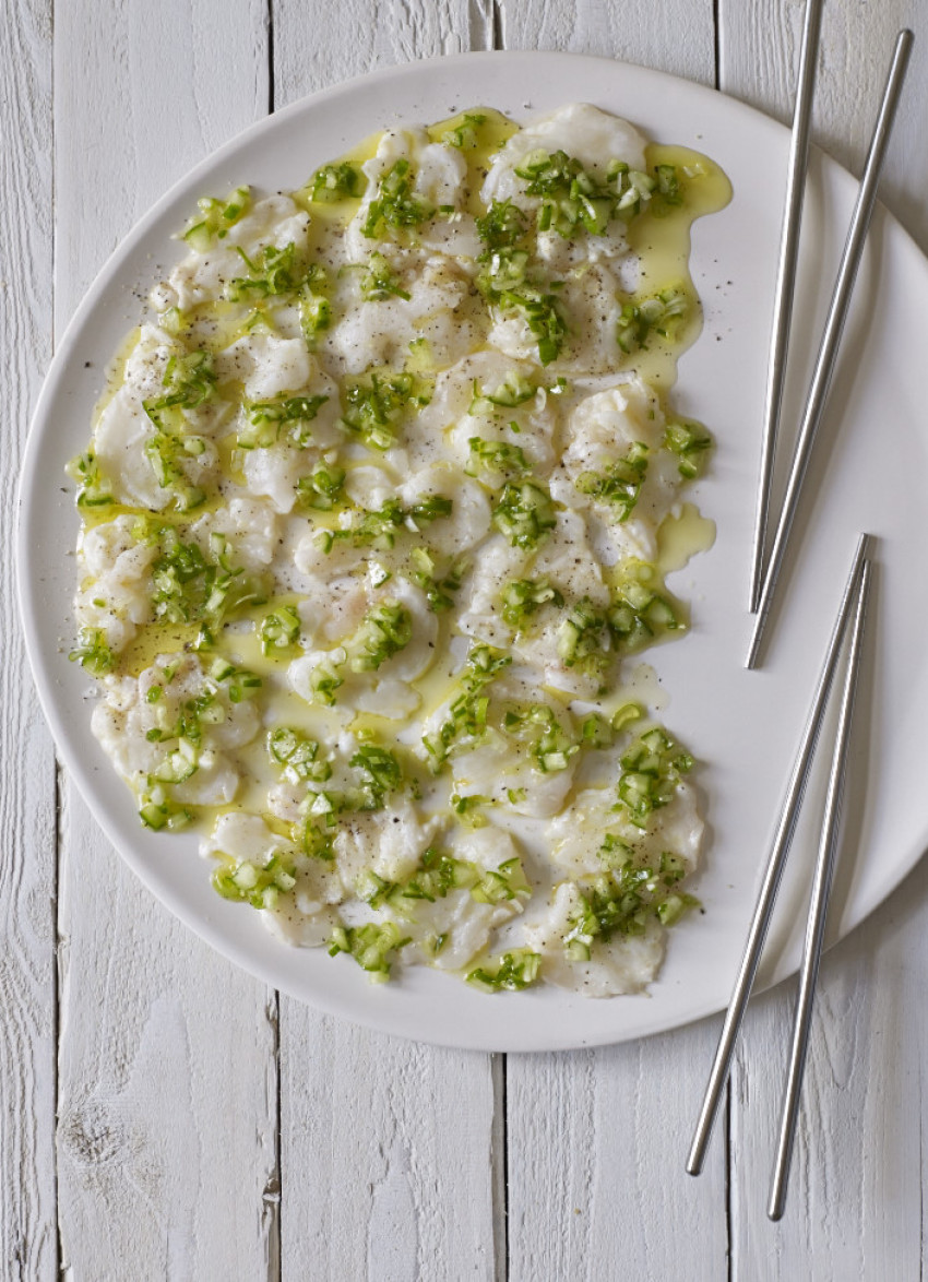 Slice the fish very thinly and place in a single layer on a large lipped tray.