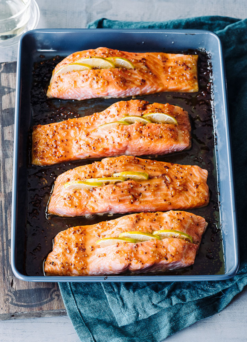 Spoon evenly over the salmon. Roast for 6 minutes, then turn the oven to grill and cook for a few more minutes until the tops of the salmon pieces are a good golden colour. Serve the salmon hot, warm or chilled.