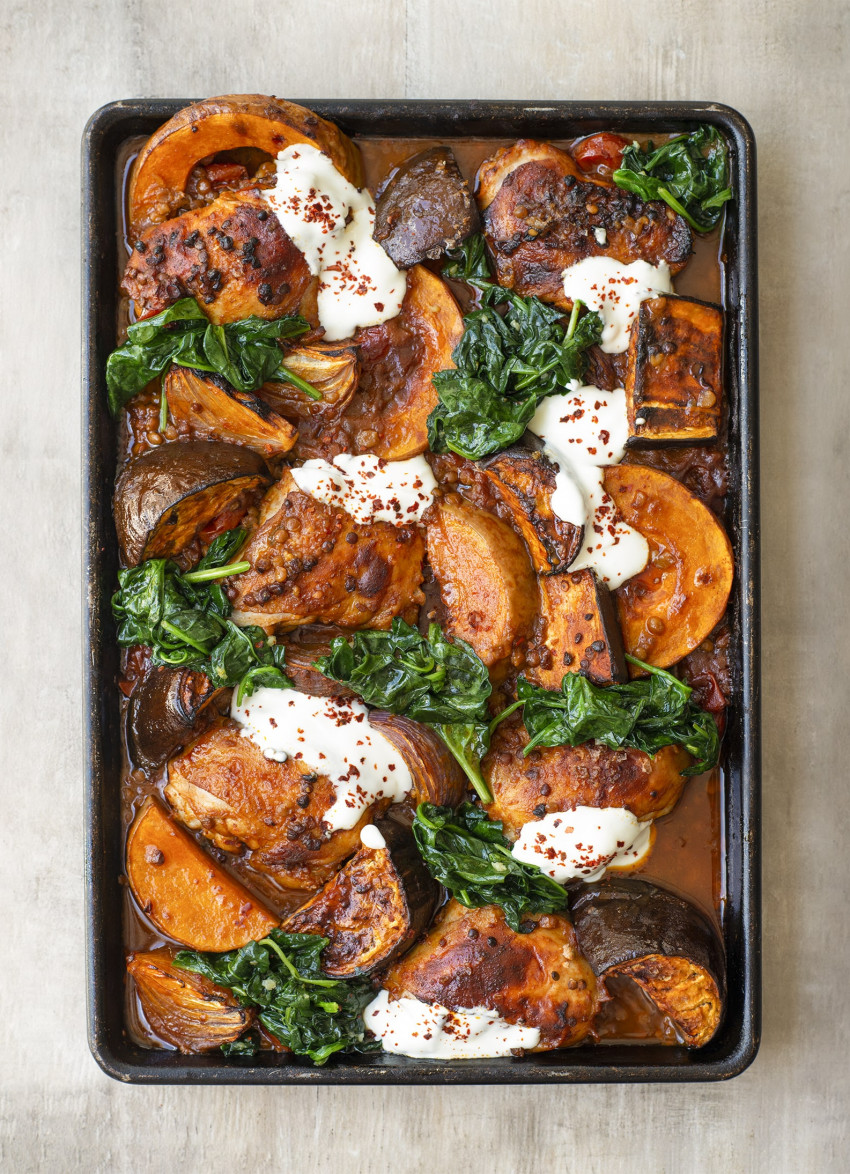 Combine all the ingredients down to and including the lentils and tomatoes in a large bowl. Add the chicken and vegetables and turn to coat well. Tip onto the tray and spread into a single layer. Season and bake for 30 minutes. Turn the vegetables over and baste the chicken. Cook for a further 15-20 minutes, or until the chicken is fully cooked. Top with the spinach, a dollop of yoghurt and sprinkle of chilli flakes.