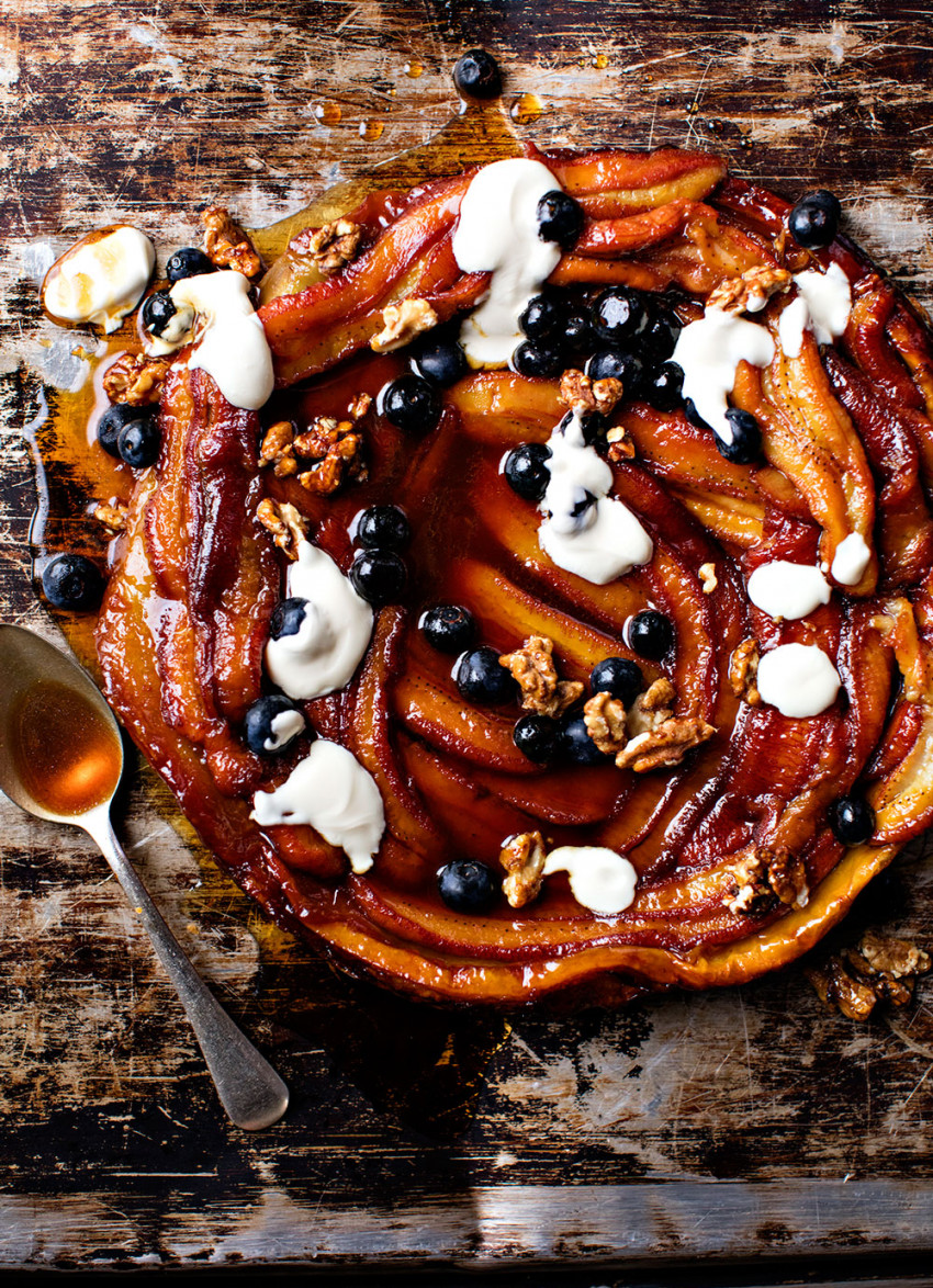Pour caramel juice from pan all over tatin. Dollop crème fraiche over the top, scatter with blueberries and walnuts and drizzle with honey to finish.