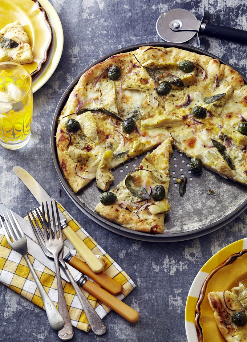 Roll the dough out on a large piece of baking paper to a 30 cm circle. Brush with oil then spread with the mascarpone. Top with the artichokes, onions, blue cheese, olives, sage leaves and ripped mozzarella. Brush everything with oil and top with a generous grating of Parmesan, salt and pepper. Bake for 10 minutes or until puffed and golden. Serve immediately. Makes 1 x 30 cm pizza