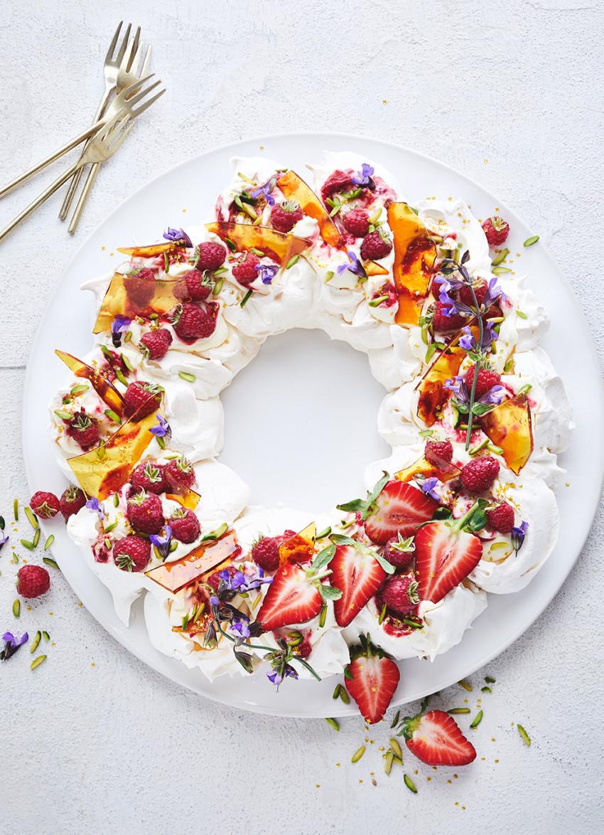 To serve: Whisk the cream, mascarpone and vanilla together to soft peaks. Dollop over the meringue and garnish as desired. Serves 10–12.
