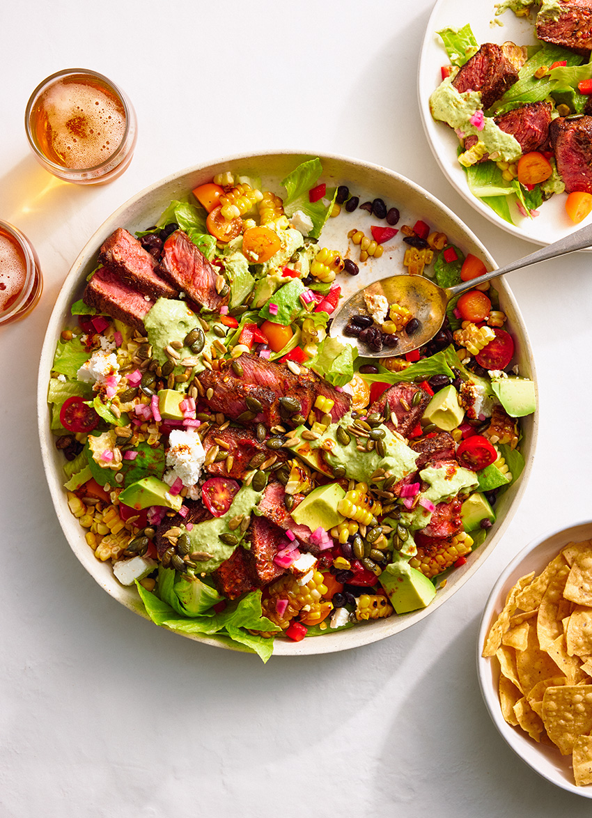 TO SERVE: Transfer the salad to a large serving plate. Slice the steaks thinly against the grain and place over the salad. Drizzle over some of the Avocado, Jalapeño and Oregano Dressing, serving the remaining dressing and corn chips separately.