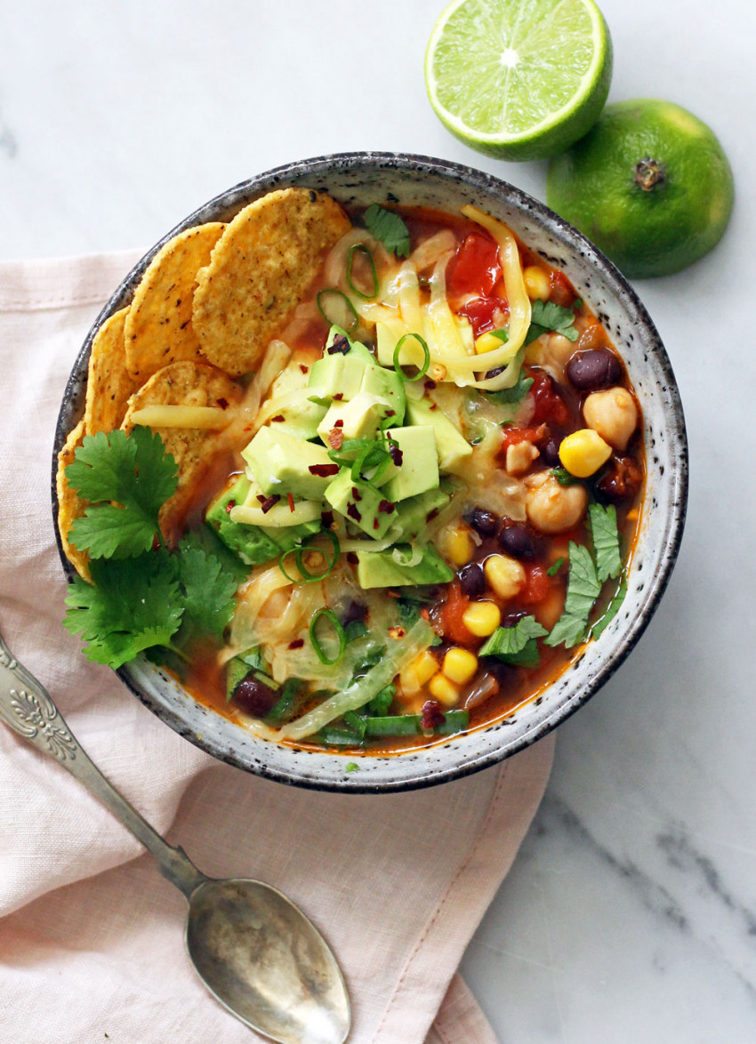 A bright and wholesome Mexican soup with handfuls of herbs, avocado and chilli. The broth is light and nourishing. I'm obsessed with this dish at the moment – it's just so simple to throw together. Leave it vegetarian or add some shredded chicken or grilled prawns.