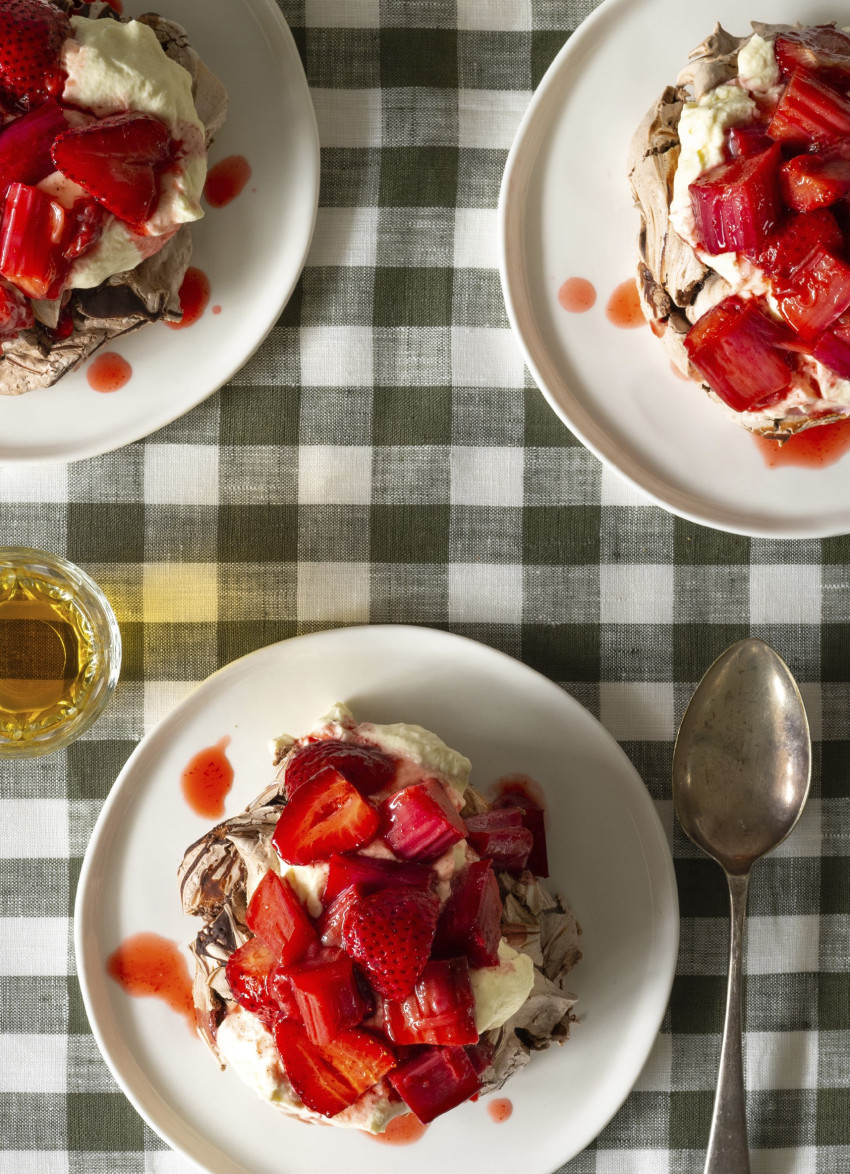 Mini Chocolate Pavlovas with Roasted Rhubarb and Strawberries