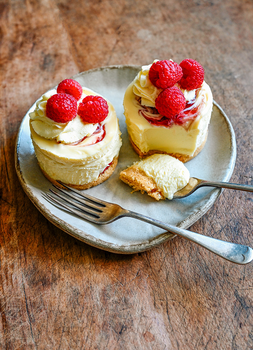 To assemble: Drop half of the berries on the firm biscuit bases, then pour over the cream cheese filling. Spoon the jam onto the cheesecake and swirl through using a chopstick. Chill overnight or for at least 6 hours.