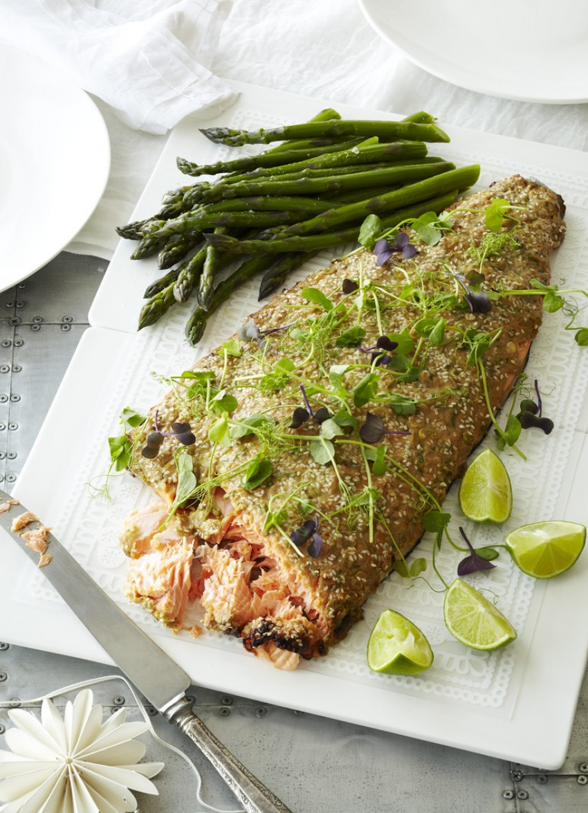 Spread the topping over the salmon in an even layer and sprinkle with the sesame seeds.