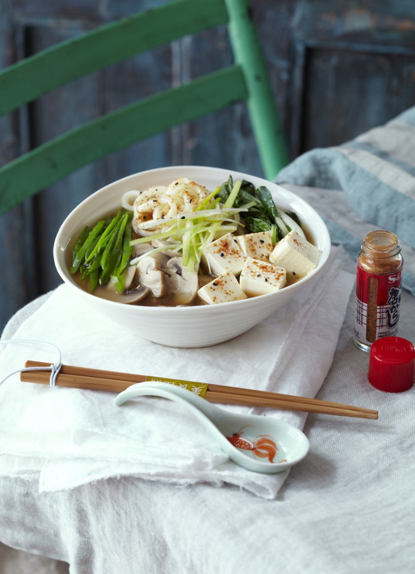 To serve: Divide the noodles between bowls and ladle over the hot soup and vegetables. Dice the tofu and place in the soup and top with the spring onions. Pass the togarashi for diners to sprinkle over if desired.