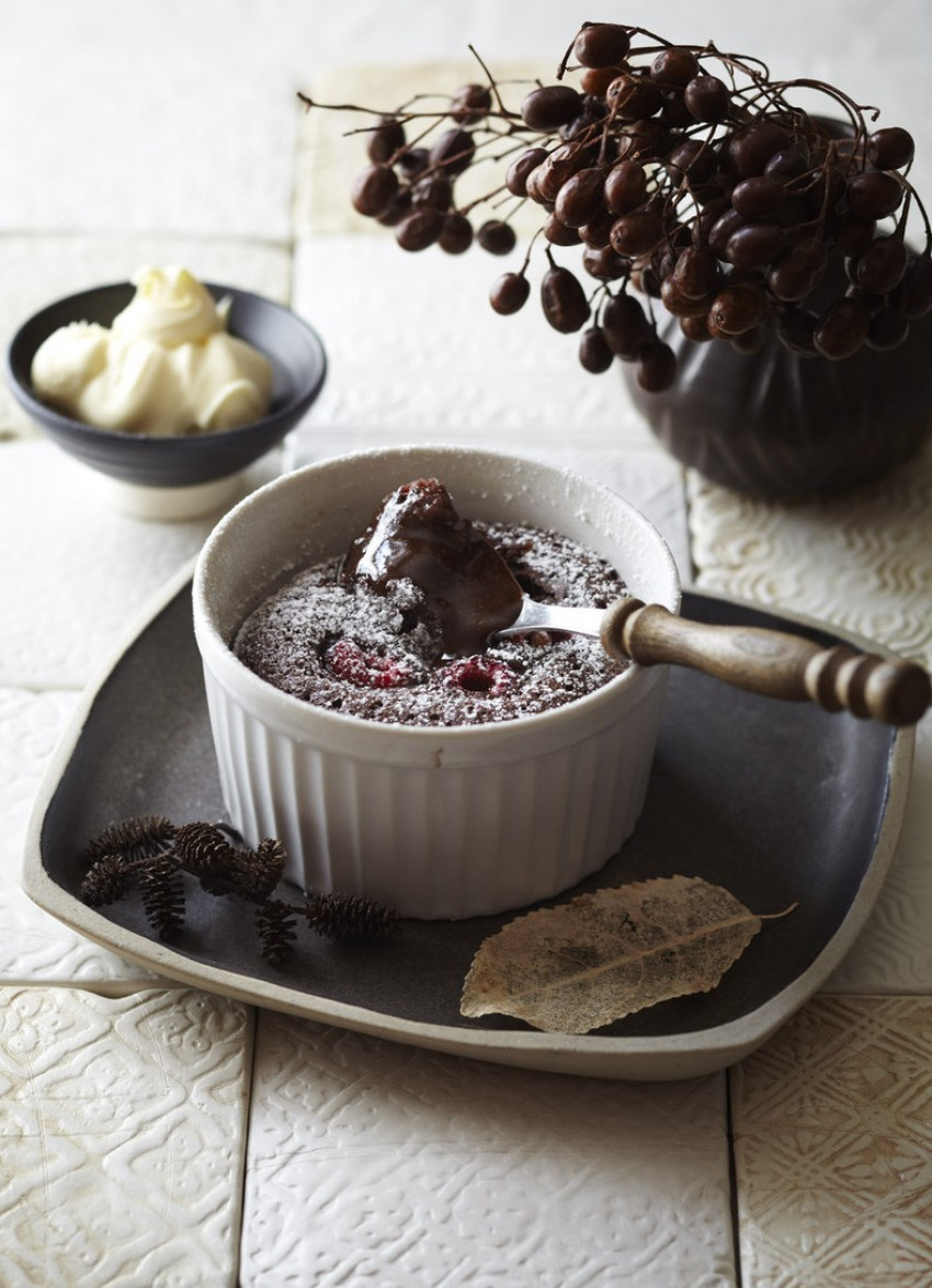 Prepare these decadent, easy chocolate puddings a couple of hours ahead, then top with the raspberries and bake while you’re eating the main course. Try using one of the many flavoured dark chocolates available, such as sea salt or orange, for a different take on a classic dessert.