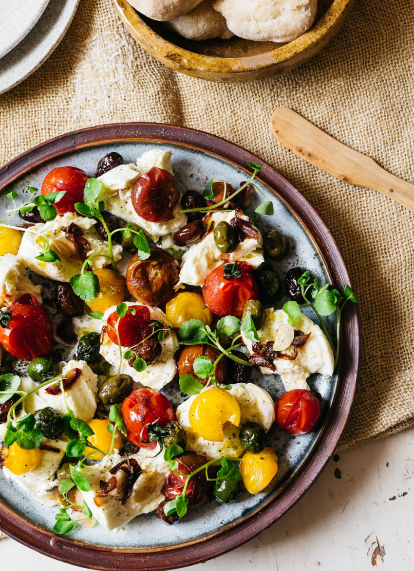Late summer on a plate: warm tomatoes top chunks of silky mozzarella and the peppery watercress adds a light freshness to the dish.