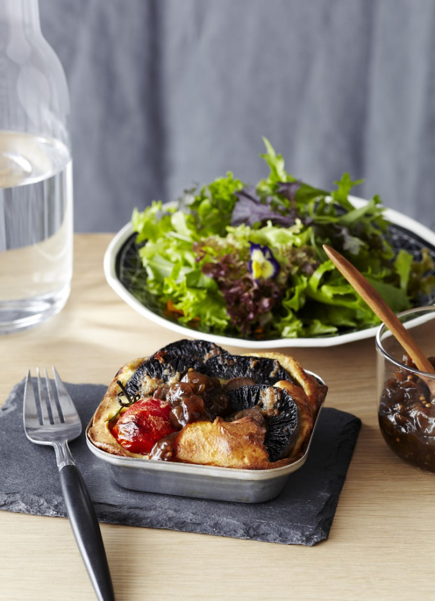 Place in the oven for 3–4 minutes until very hot. Divide the batter between the hot dishes, taking care not to splash yourself, then add 4 mushrooms, nestling them against one another to stand up, and one tomato to each tin.