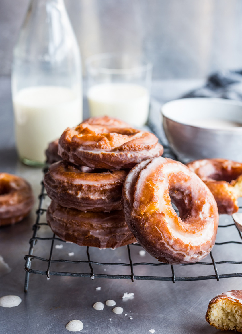 Delicious spiced sour cream cake doughnuts with a salty maple glaze.