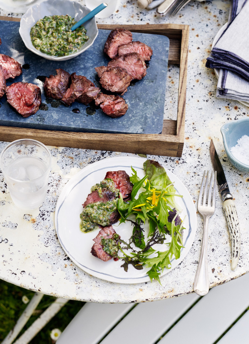 Slice the steaks across the grain and pour over any resting juices. Serve with the herb salsa.