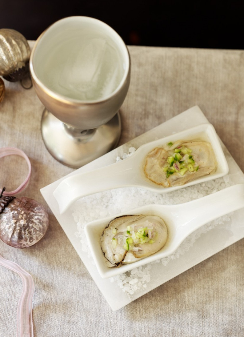 To serve: Scatter the salt over a serving tray and nestle in the soup spoons. Place an oyster in each spoon and spoon over the dressing, making sure each oyster gets some of the shallot and cucumber. Serve immediately. Makes 16