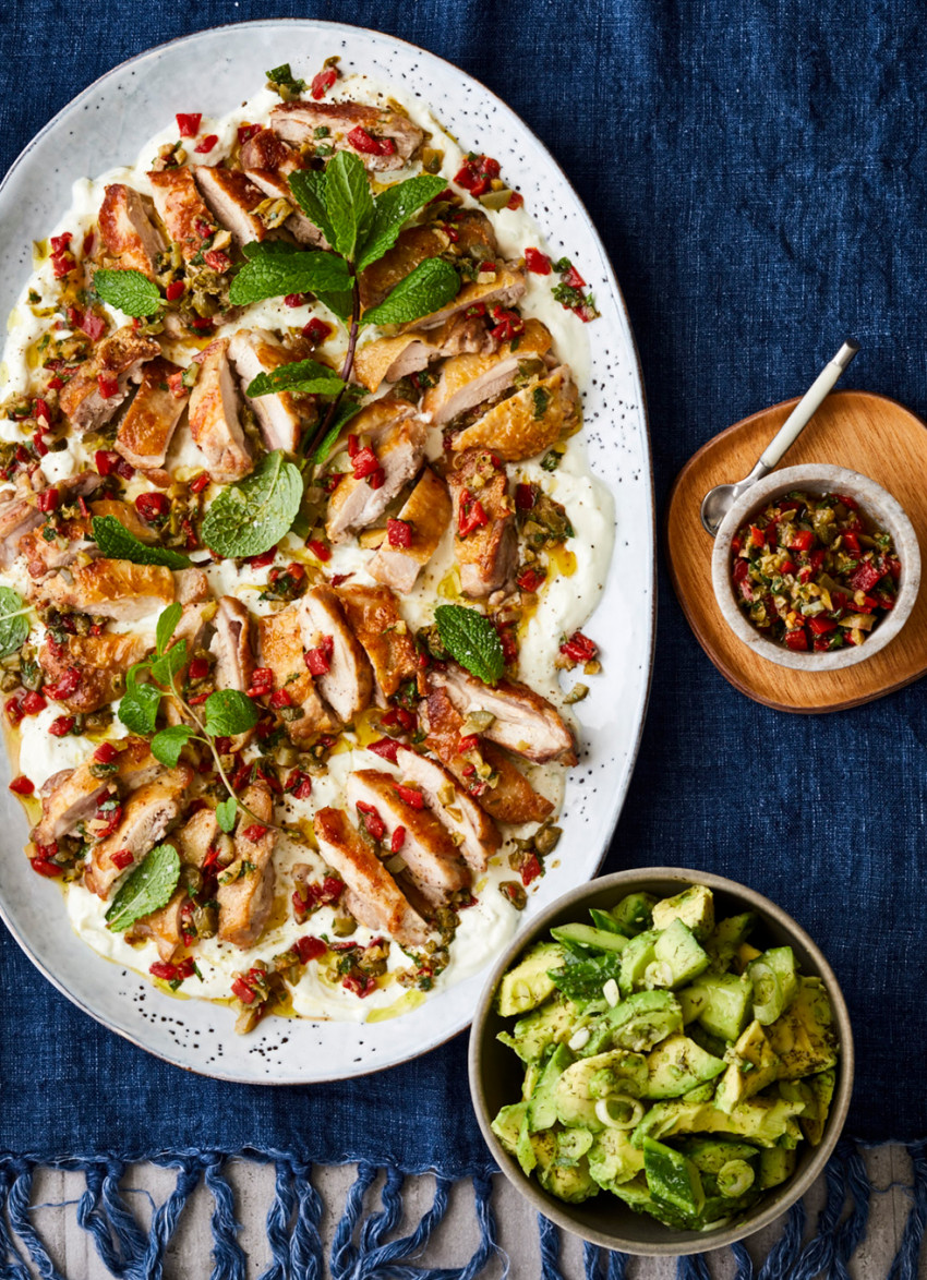 To serve: Spread the tzatziki or hummus over the base of a platter and spoon over half the salsa. Top with the sliced chicken and remaining salsa. Serves 4–6.