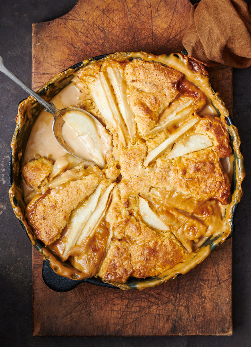 Bake for 35-40 minutes, or until the top is golden and puffed and the caramel is bubbling up. Serve warm with crème fraîche, cream or ice cream.