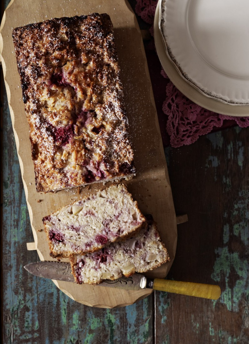This is a moist, dense almost sticky loaf that’s filled with chunks of pear and slightly tart raspberries. Great eaten plain or lightly grill thick slices of the loaf and serve with a smear of ricotta for a delicious brunch or top with a scoop of ice-cream for dessert