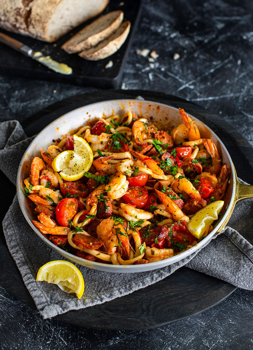 Increase the heat and add the squid rings. Cook for 30-40 seconds, stirring until they are just cooked through. Add to the chorizo.