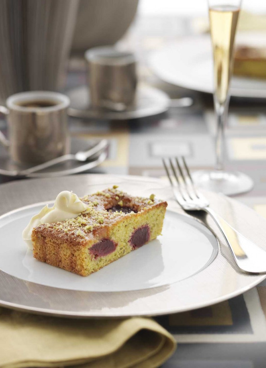Put the pistachios and ground almonds in a food processor and process until finely chopped. Set aside one tablespoon of the nuts and tip the remaining nuts into a medium bowl. Add the flour, sugar, butter, lime and orange zests, eggs and vanilla extract. Beat with a wooden spoon to combine. Pour the mixture into the lined tart tin and spread out evenly.
