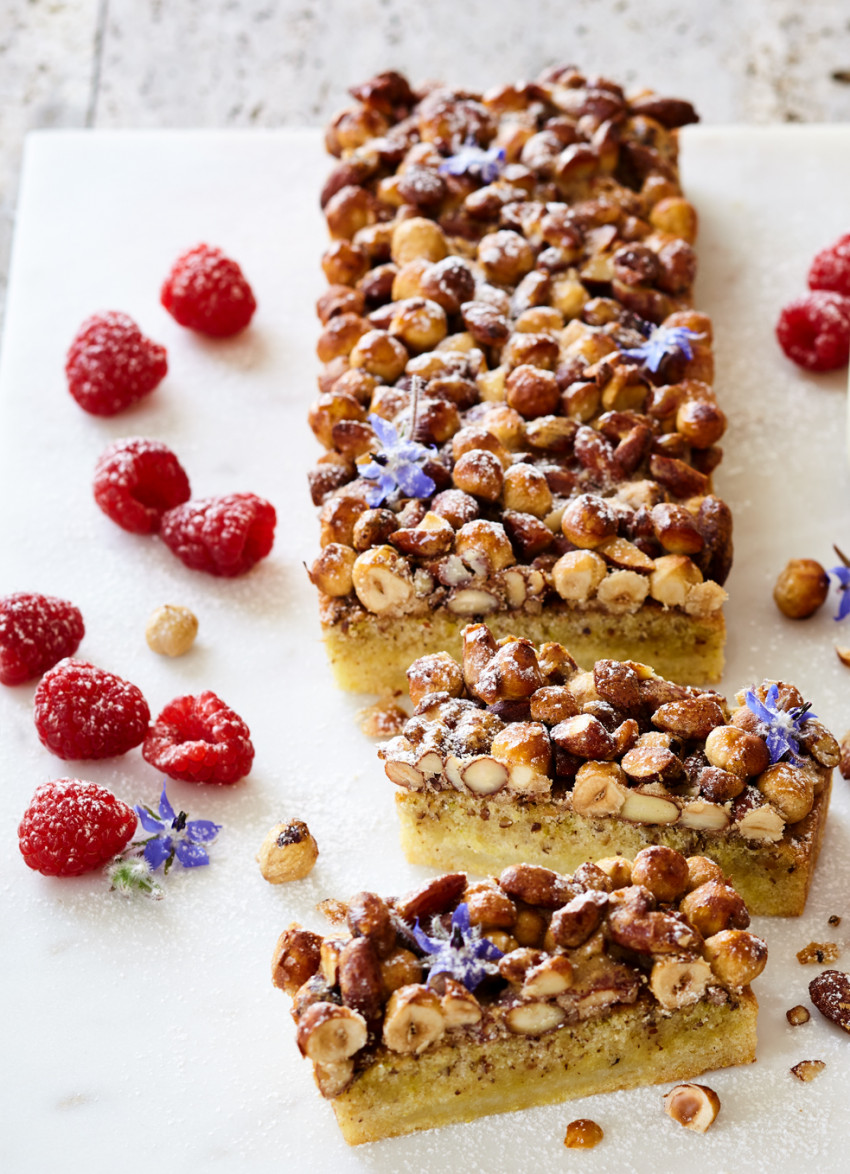 Remove from the oven. Give the nuts a good stir, then carefully spoon on top of the cake, distributing them evenly. Place back in the oven for about 15 minutes or until the top is golden and set. Cool completely in the tin.