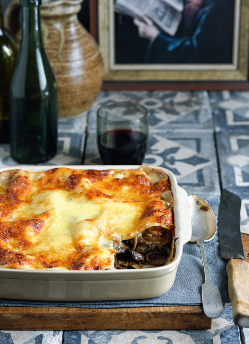 Put a thin layer of bechamel in the base of a 23cm x 23cm baking dish and lay lasagne sheets on top. Spoon over half of the mushroom mixture and top with a third of the remaining béchamel. Repeat layering with more lasagne sheets, mushrooms and béchamel, finishing with the last of the lasagne sheets and béchamel.