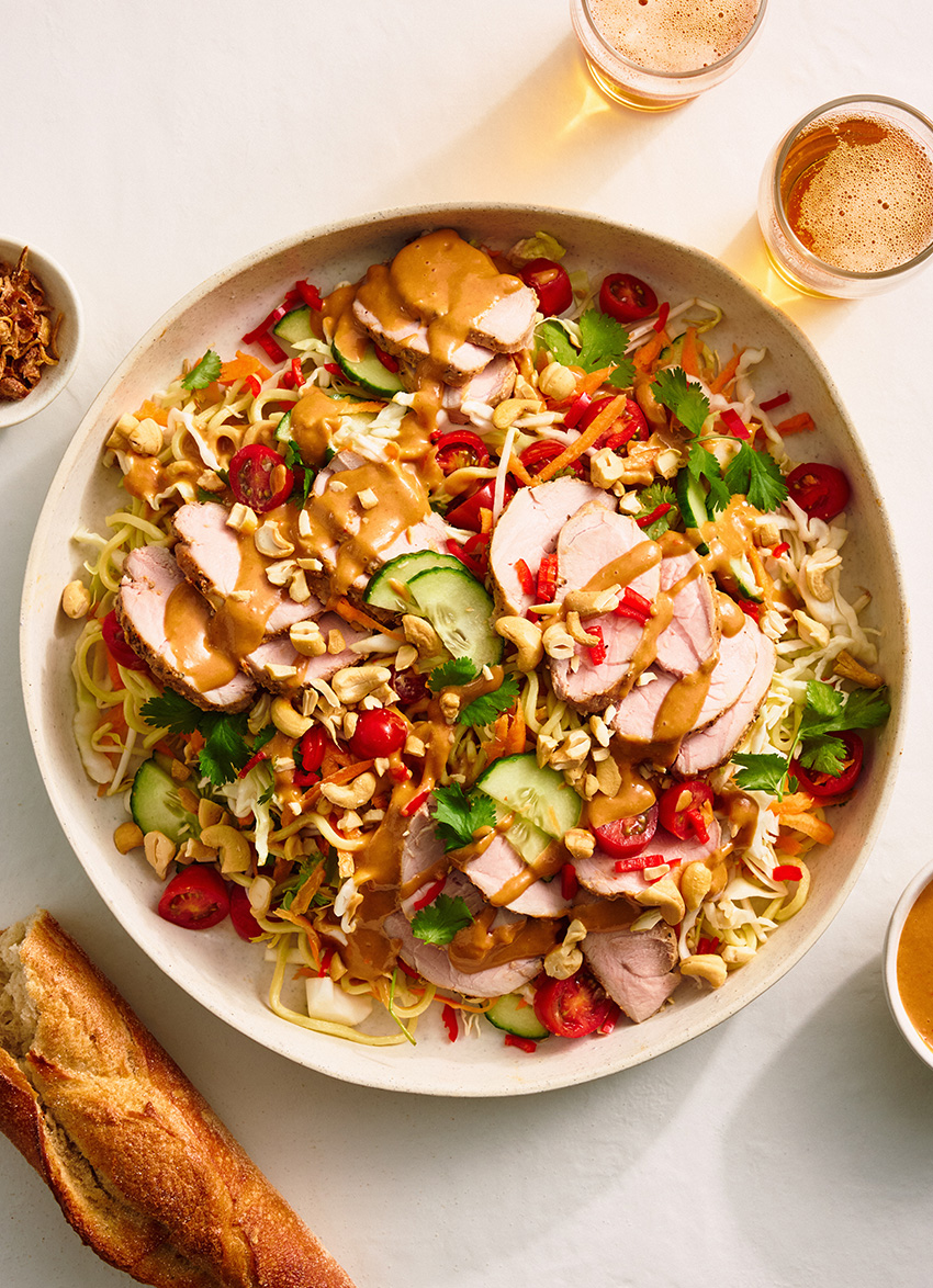 TO SERVE: Place the salad on a large serving plate and arrange the pork over the top. Drizzle with a little more dressing and garnish with crushed cashew nuts, shallots and chilli. Squeeze over the lime wedges before eating.