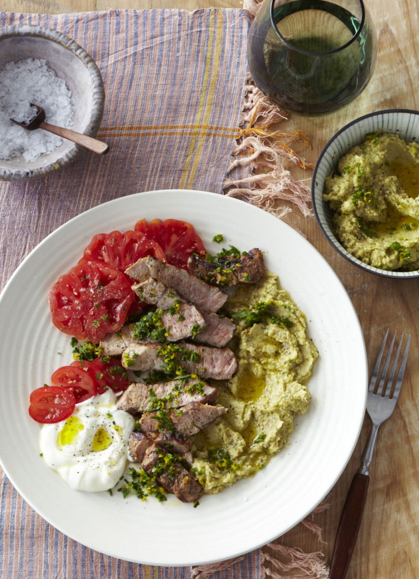 Divide the hummus between plates. Top with the pork and any resting juices.