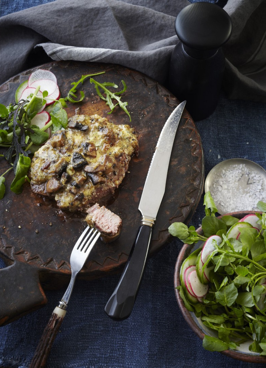 Steaks: Rub the steaks with a little oil, salt and pepper. Heat a sauté pan or ridged grill until hot and cook the steaks for about 3–4 minutes each side or until cooked to your liking. Remove from the heat and divide the crust evenly between the steaks.