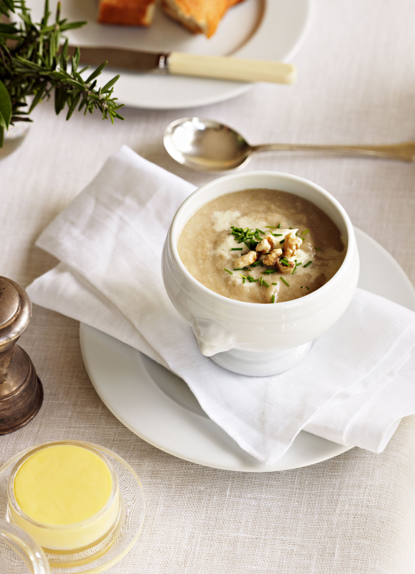 To serve: Stir in the lemon juice and ladle the soup into warm bowls. Top with a spoonful of crème fraîche, toasted walnuts and chopped chives.