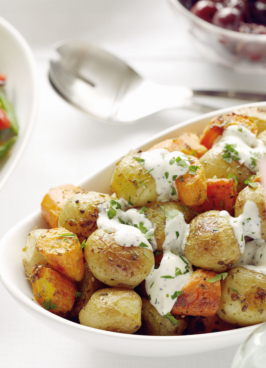 Dressing: Whisk the sour cream until smooth then stir in the yoghurt, garlic and the poppy seeds. Season with salt and freshly ground pepper.