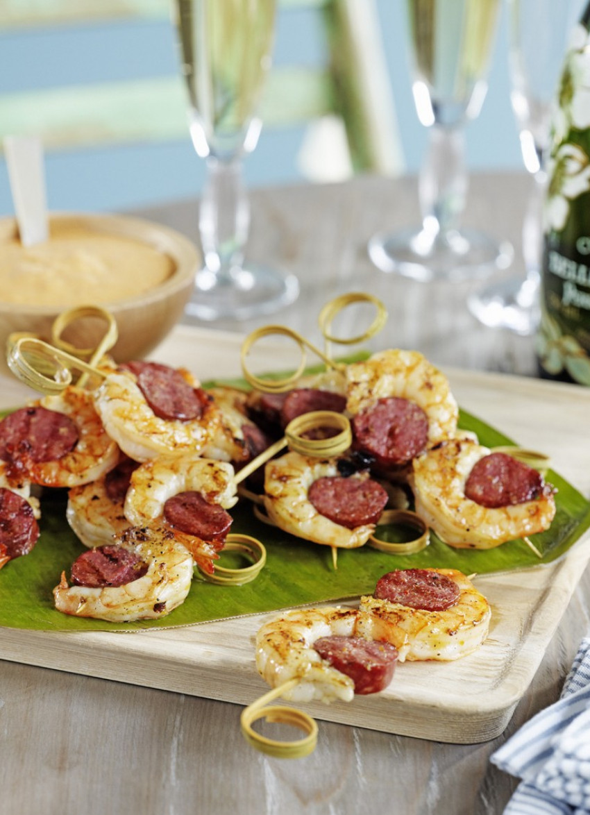 To cook: Season the kebabs and grill on a preheated barbecue for 2 minutes each side or until the prawns are just cooked through. Arrange on a platter and serve with the aioli. Makes 12