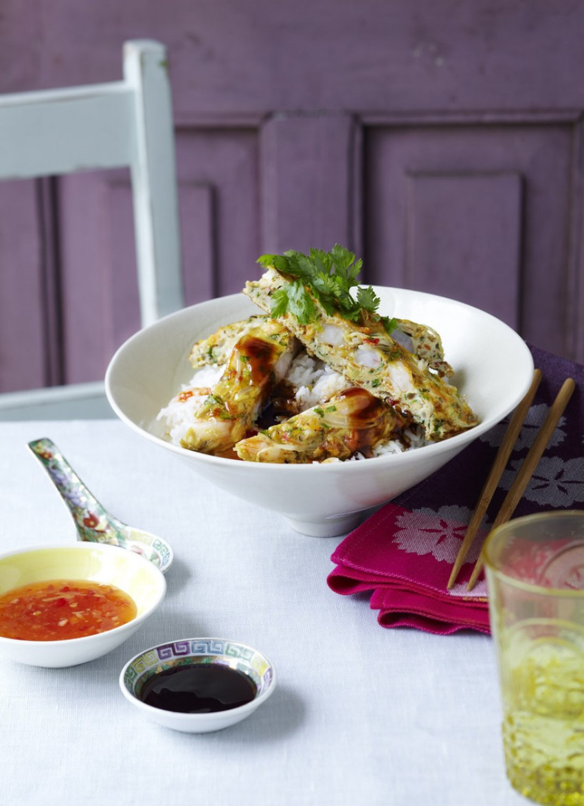 To serve: Place the hot rice into bowls. Slide the omelette onto a board and cut into strips. Place on top of the rice with a few coriander leaves. Serve with bowls of sweet chilli sauce and oyster sauce on the side.
