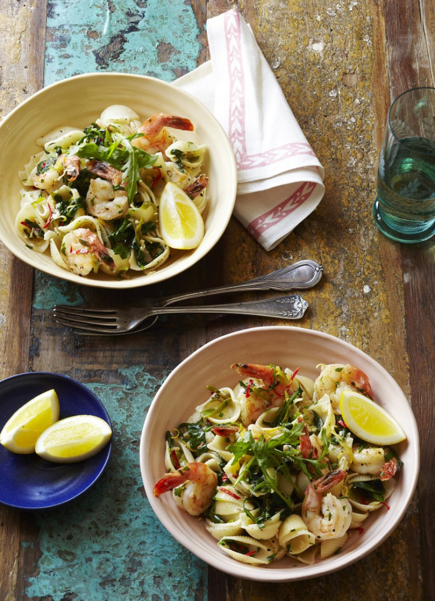 Prawns: Heat the oil in a large sauté pan and when hot add the prawns, season and cook for 2 minutes. Add the garlic, chilli, spring onions and lemon zest and cook for 1 minute, stirring constantly. Add the rocket, lemon juice, parsley and the reserved ¼ cup cooking water. Toss everything together until the rocket has just wilted then add the hot cooked pasta and combine.