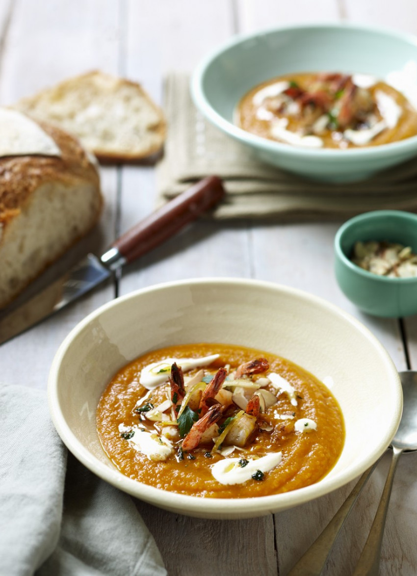 Spice up your regular pumpkin soup with the warmth of smoked paprika, the tang of preserved lemon and crunchy almonds all topped off with juicy prawns.